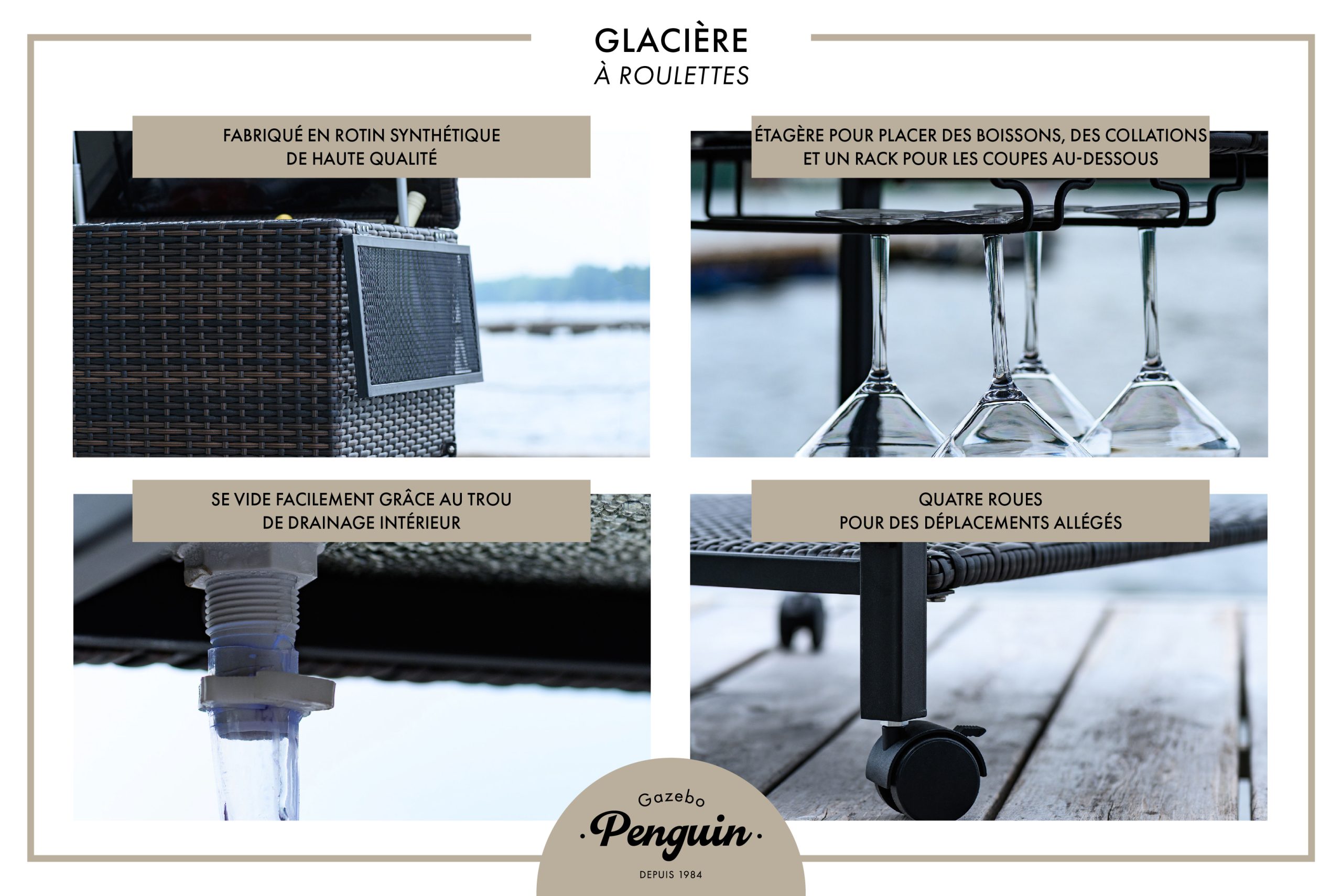 La glacière sur roulettes comprend des tablettes pour y placer vos boissons, collations et aliments. Elle est légère, durable et stable, la glacière se vide facilement par son trou de drainage intérieur.